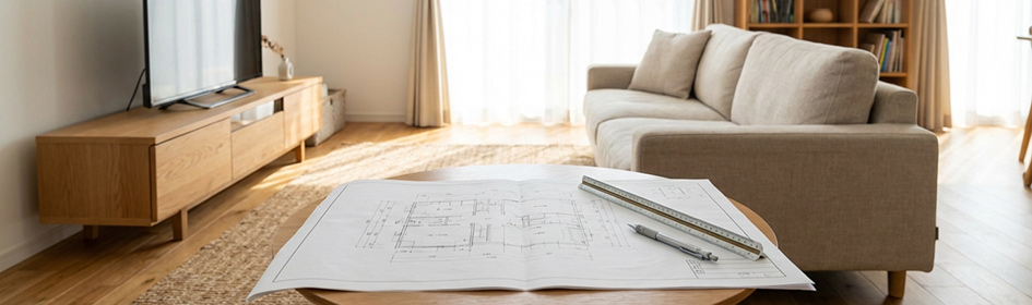 ソファ・テレビ台・本棚・テーブルそれぞれの標準寸法を起点に、搬入経路・配線・固定・視聴距離まで図面に落とし込むことで、現場での手戻りと完成後のクレームを大幅に減らすことができます。